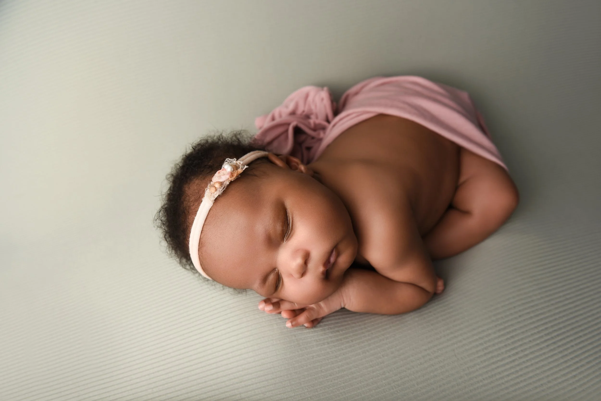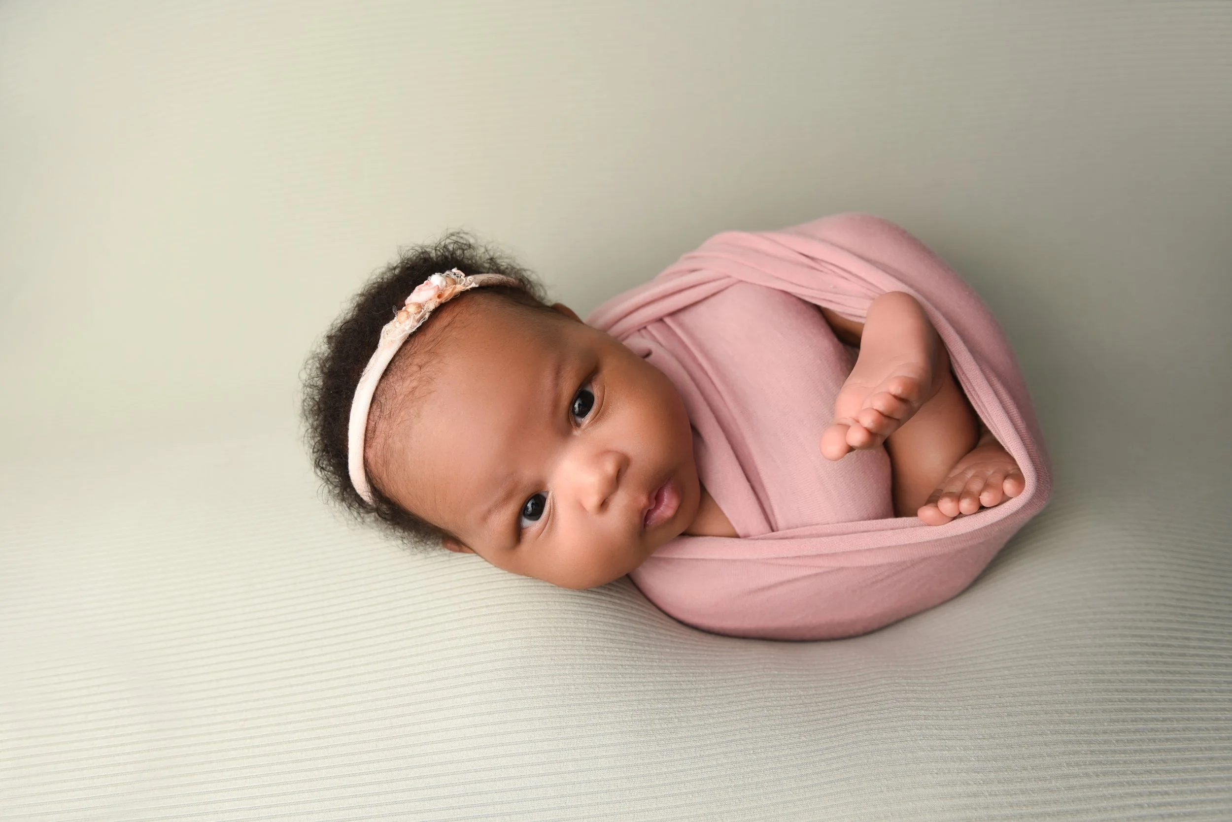 A sweet baby girl wrapped snugly in blush pink fabric with a tiny floral headband, captured on a soft cream backdrop. This image embodies the simple, cozy style of a mini newborn session.