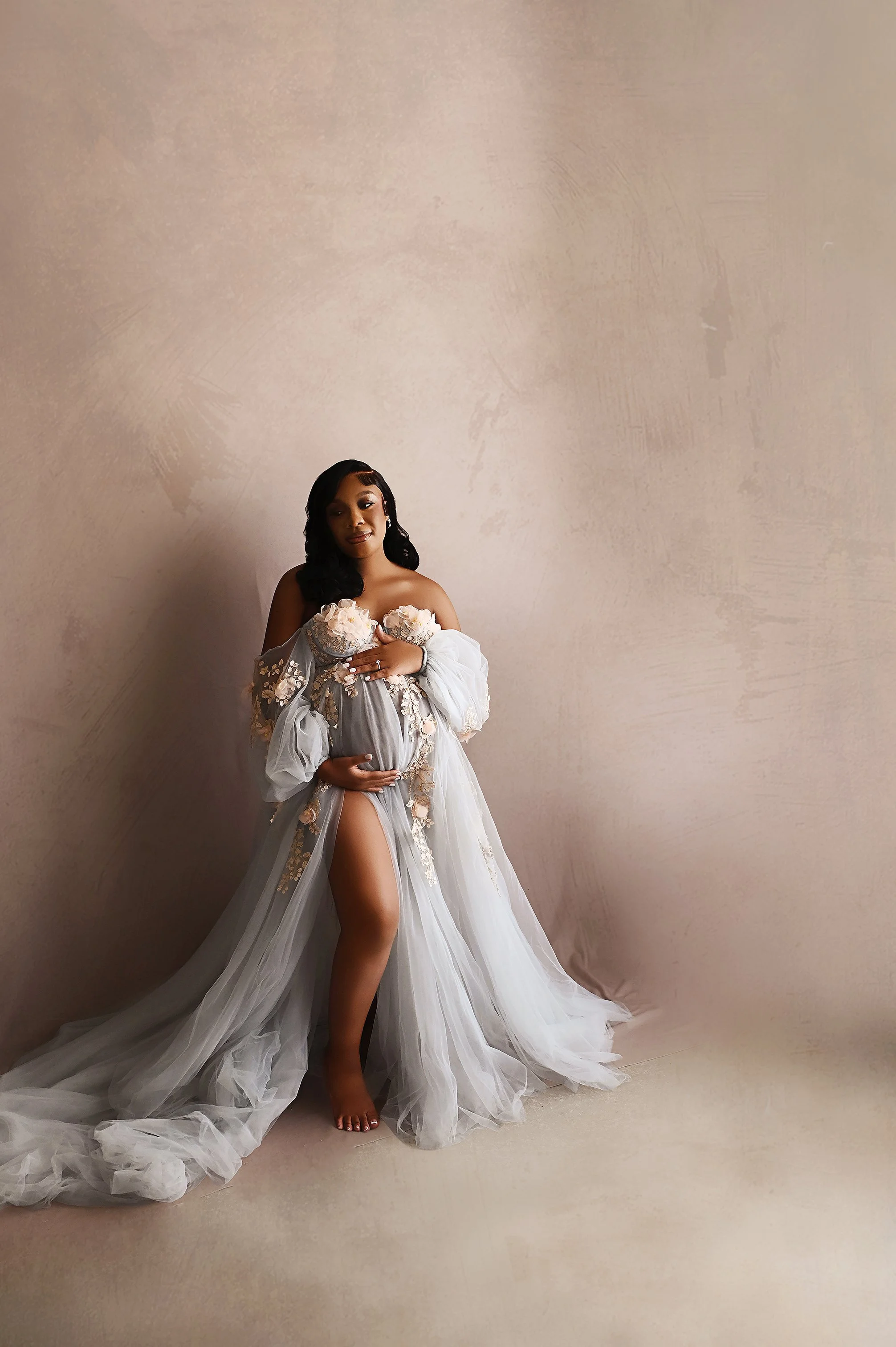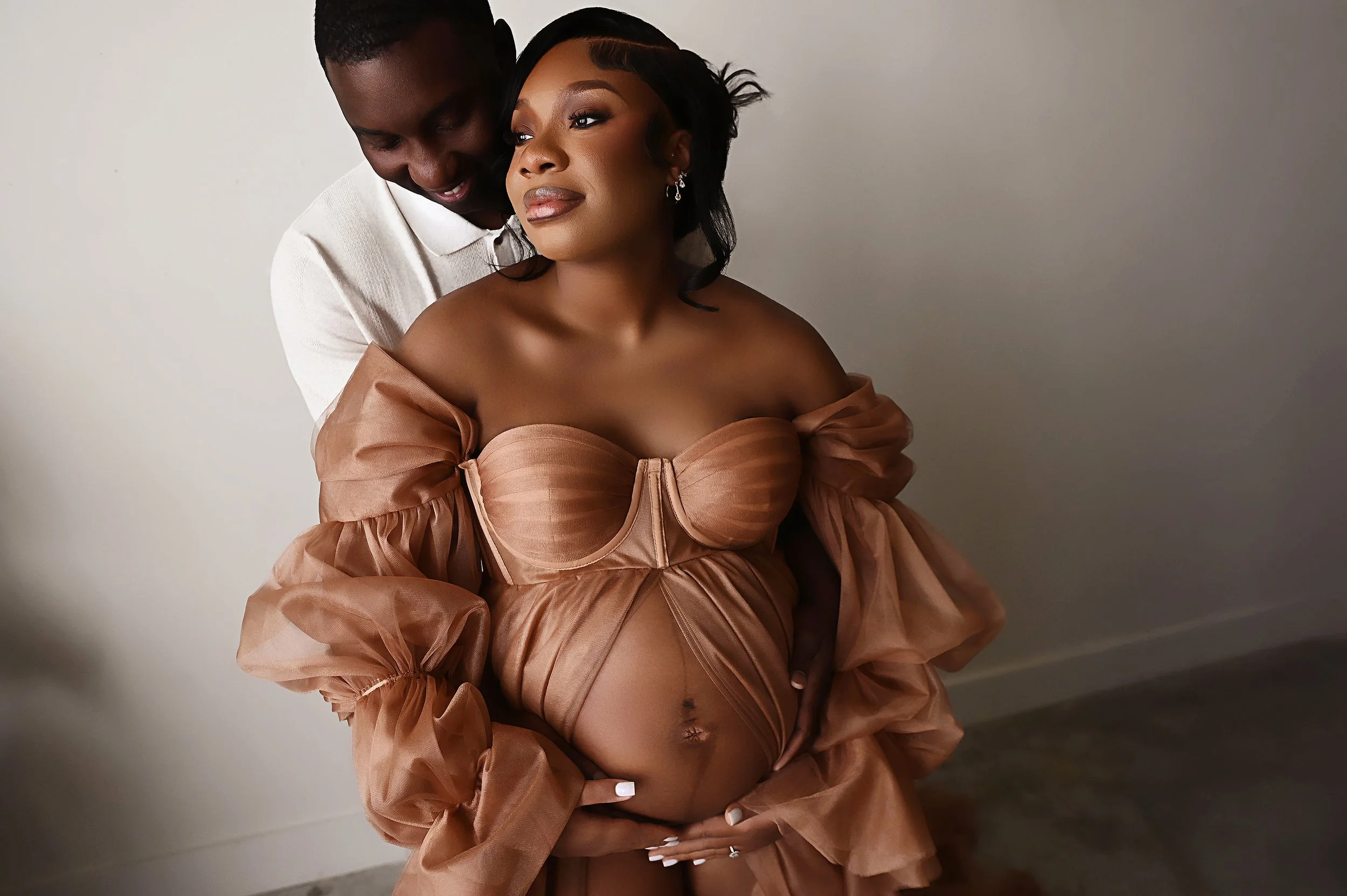 This maternity session was all about softness and strength. We styled several looks in warm neutrals, from flowing chiffon and blush tones to a rich bronze gown that shimmered beautifully in the studio light. Each outfit highlighted her growing belly and the glow that only motherhood brings.