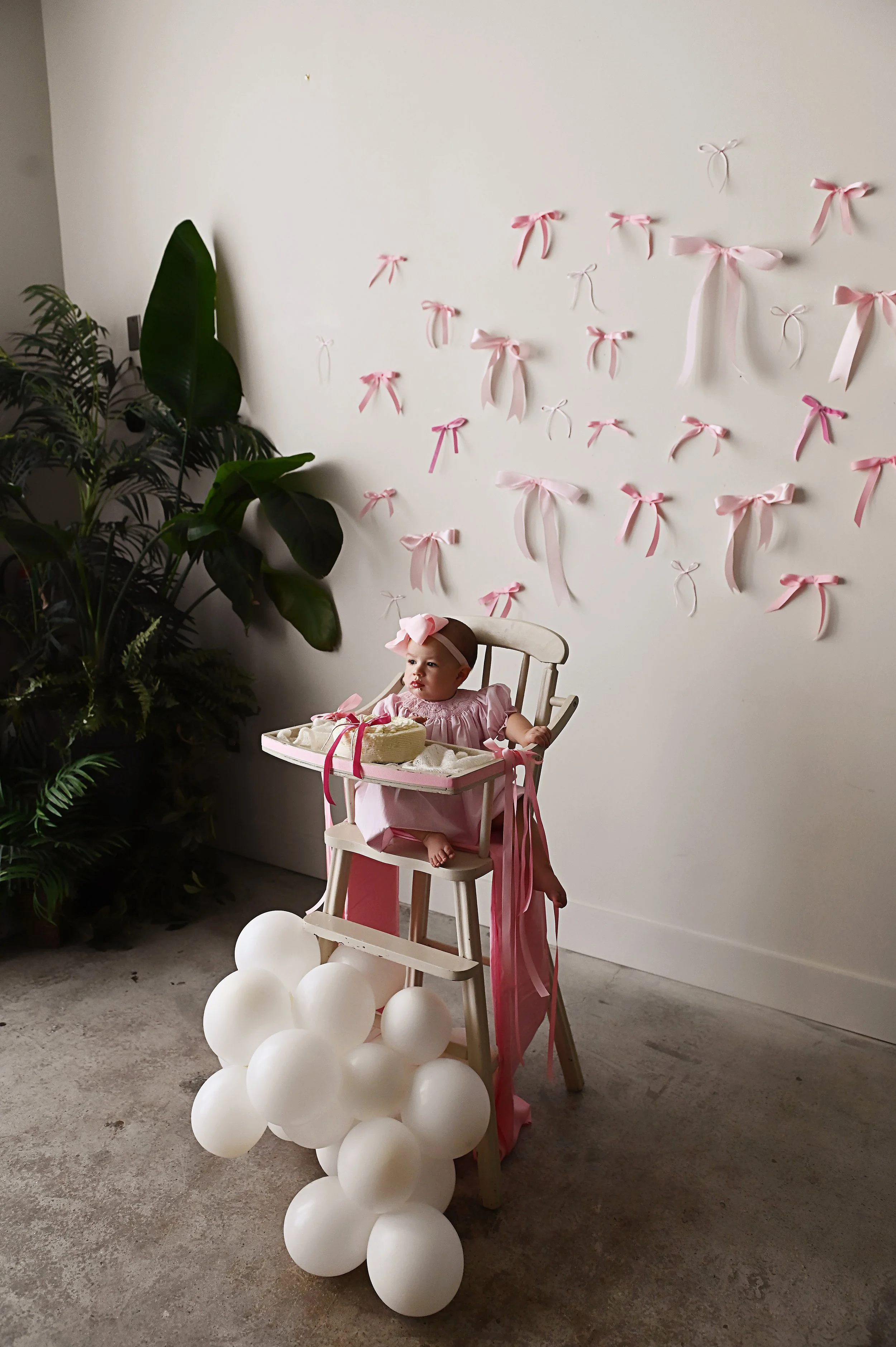 There’s something so timeless about a cake smash session with a soft and simple setup. This sweet baby girl’s milestone session took place in my Shreveport studio, surrounded by delicate pink ribbons, warm natural light, and the sweetest vintage high chair.