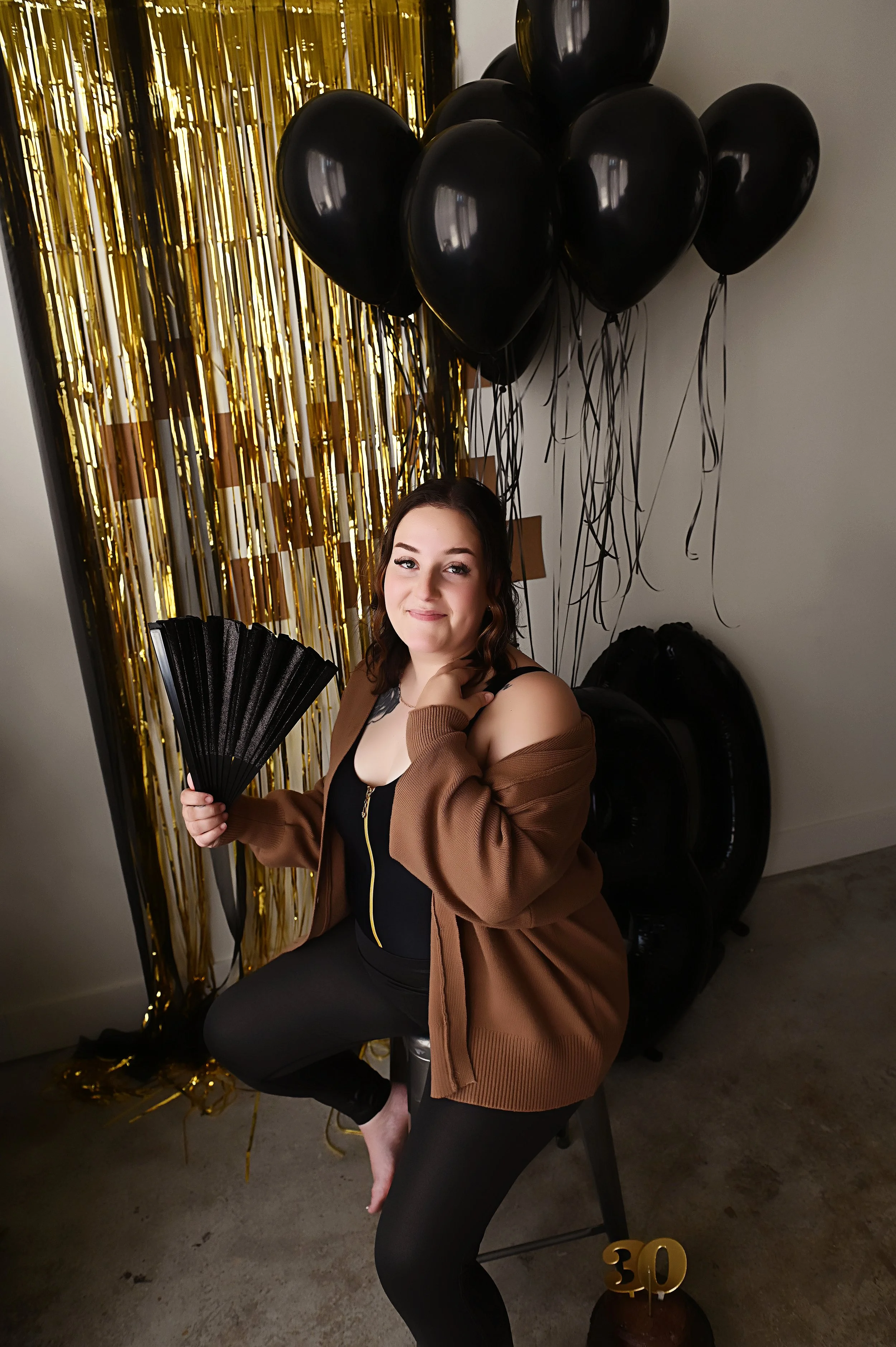 This studio birthday session took place in Shreveport with soft window light, gold fringe, and black balloons. I photograph milestone birthdays with simple sets, cake, and coffee inspired props that keep the focus on personality and joy. If you need ideas for your own photos in Shreveport or Bossier City, I can style a clean studio look that feels modern and relaxed.