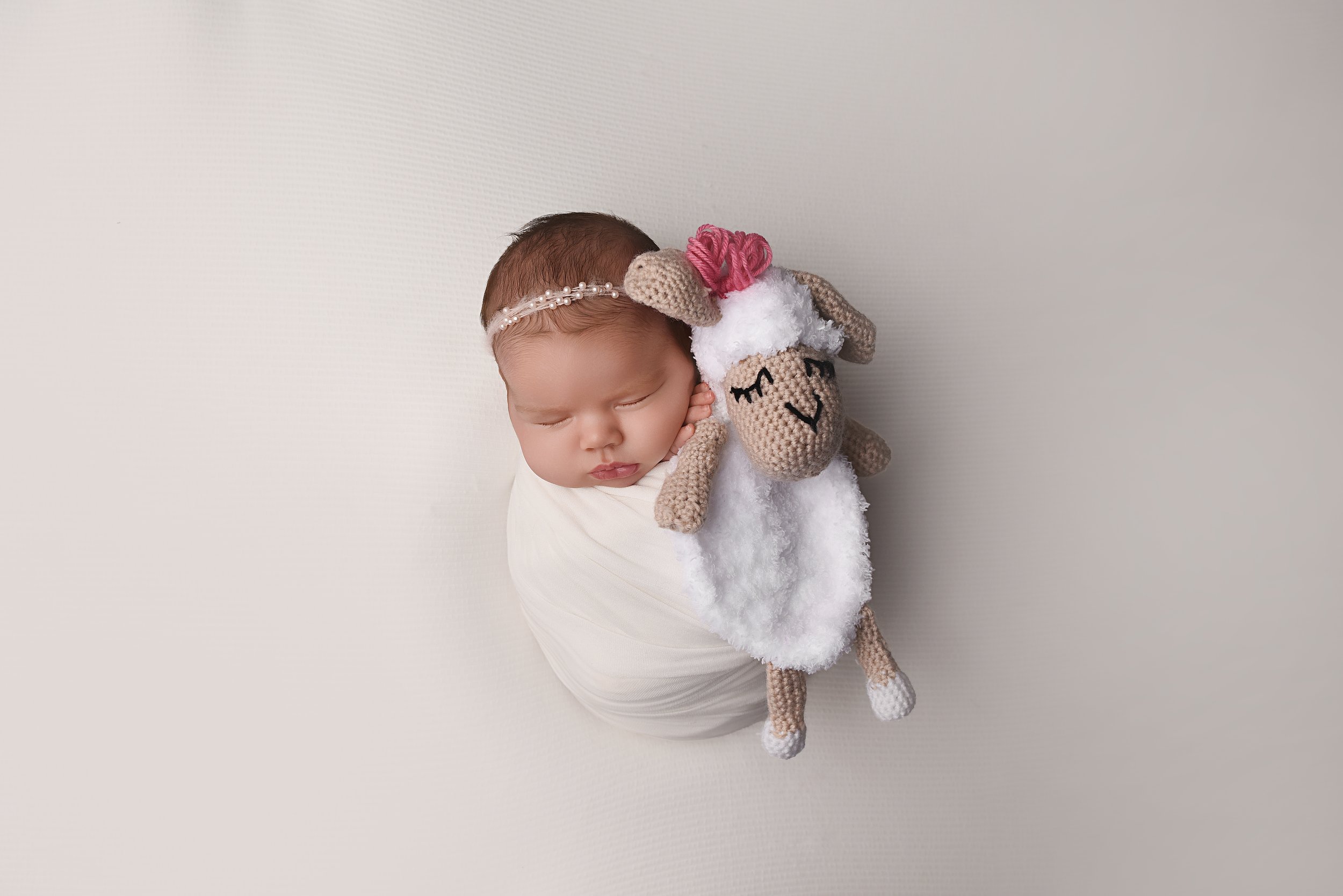 We also incorporated a few playful touches, like a handmade lamb prop that Mama brought, before transitioning to more natural portraits with her awake. One of the best things about walk in sessions is the flexibility. I keep the posing flow simple and comfortable so babies remain calm and cozy throughout.