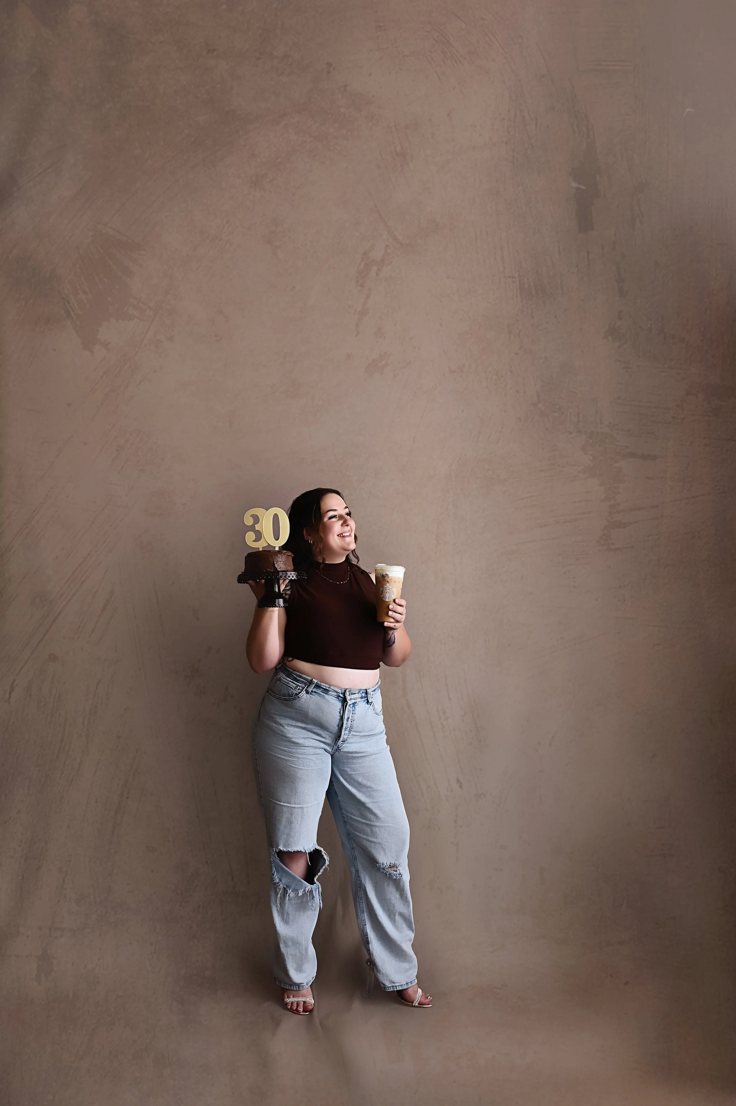 We wanted this shoot to feel warm and inviting while still keeping a hint of playful glamour. The studio’s neutral backdrop allowed the gold accents, cake topper, and balloons to pop. We incorporated different setups so she could enjoy each part of her celebration; from posing with oversized “30” balloons to savoring her favorite coffee and blowing out candles on a decadent cake.