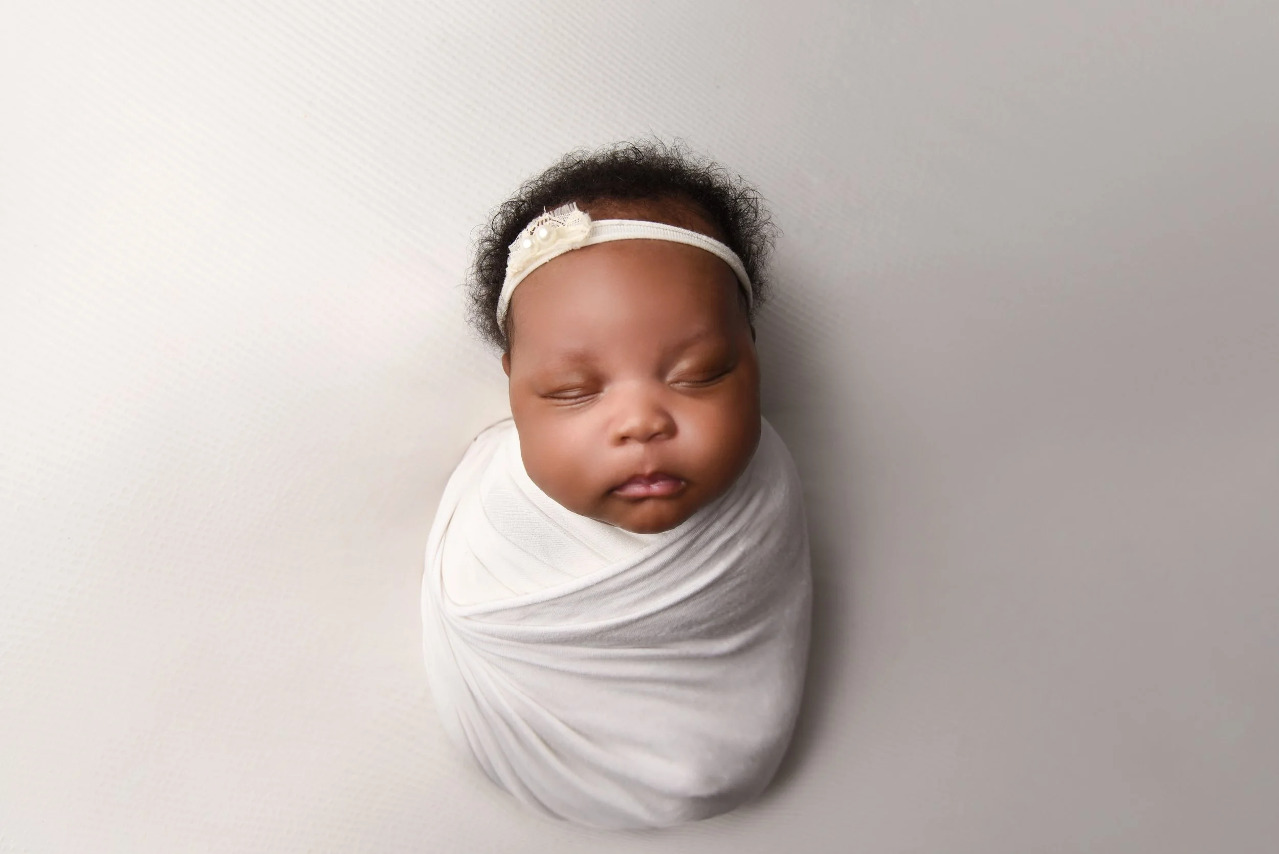 A timeless newborn portrait with a baby girl swaddled in white, her head adorned with a delicate cream bow