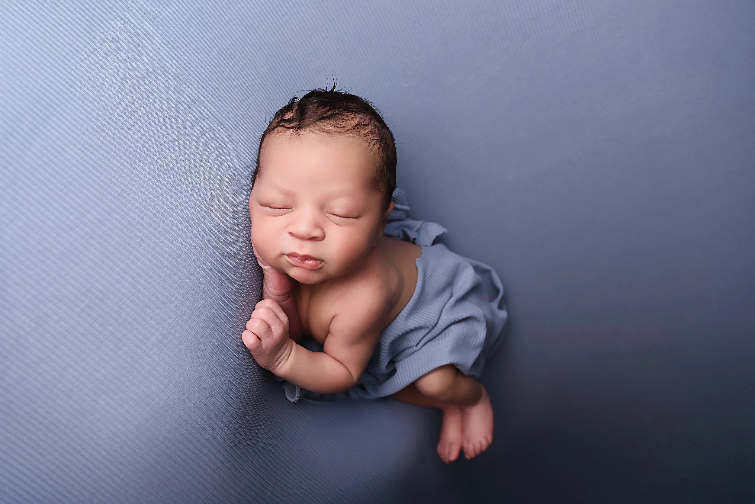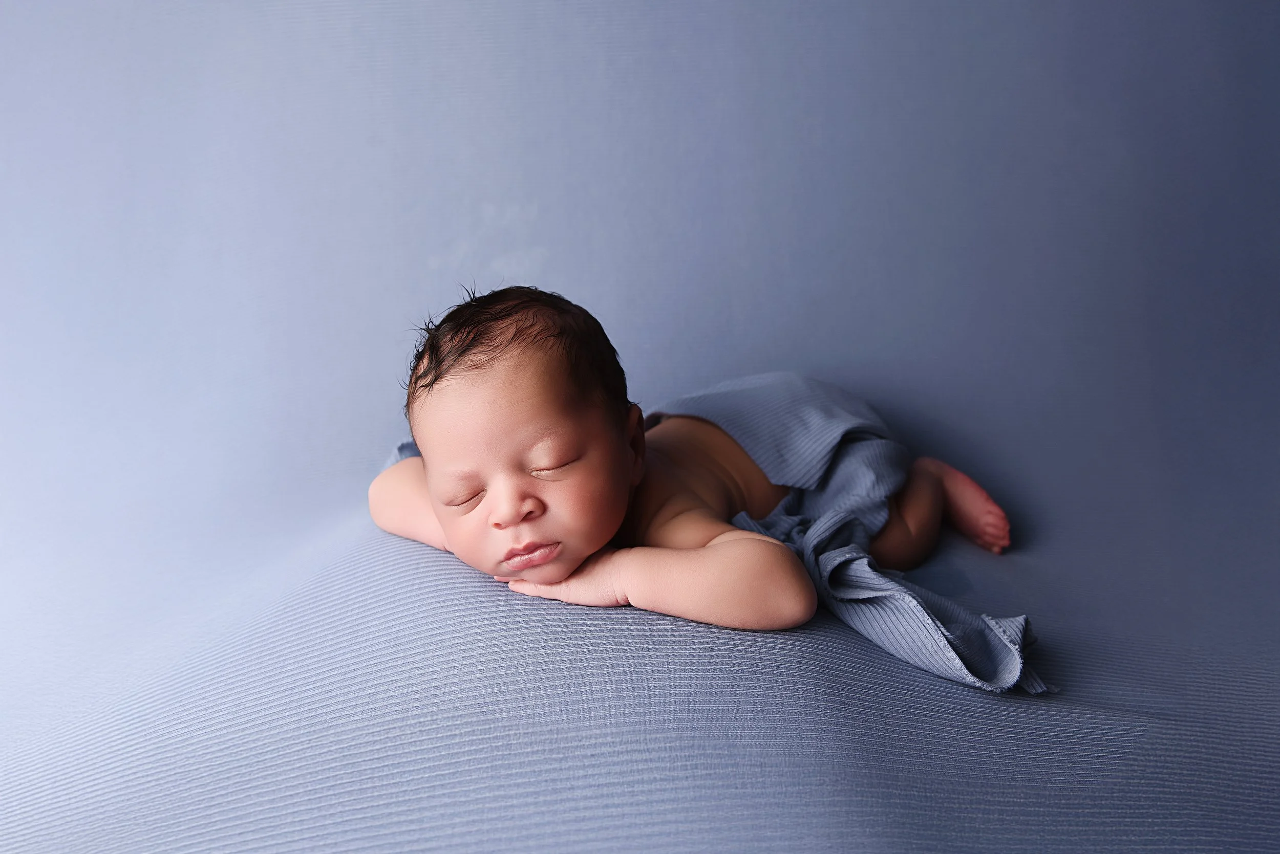 Peaceful newborn portrait featuring a baby boy posed on his side with a ribbed blue blanket, captured on a soft textured blue backdrop during a studio session