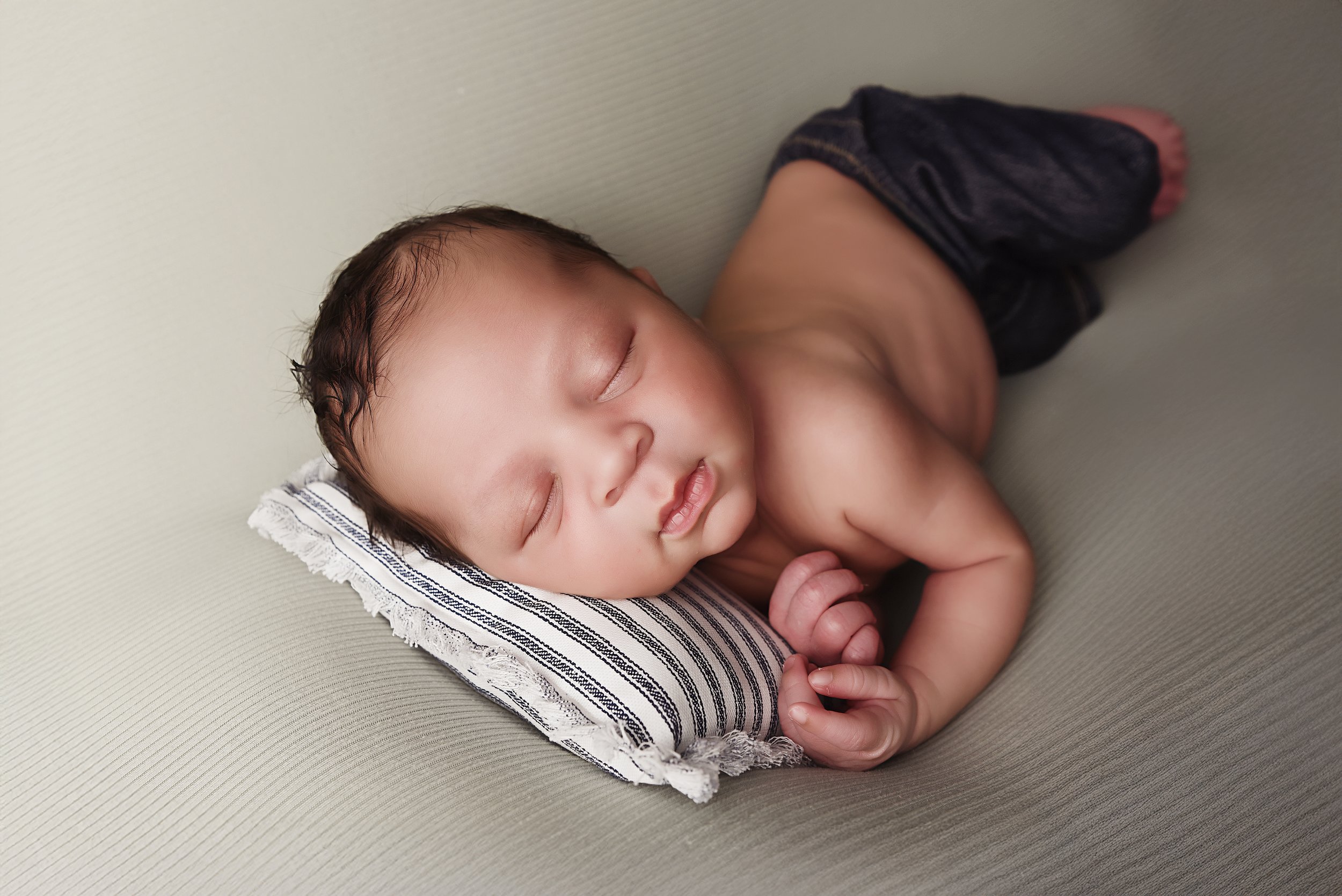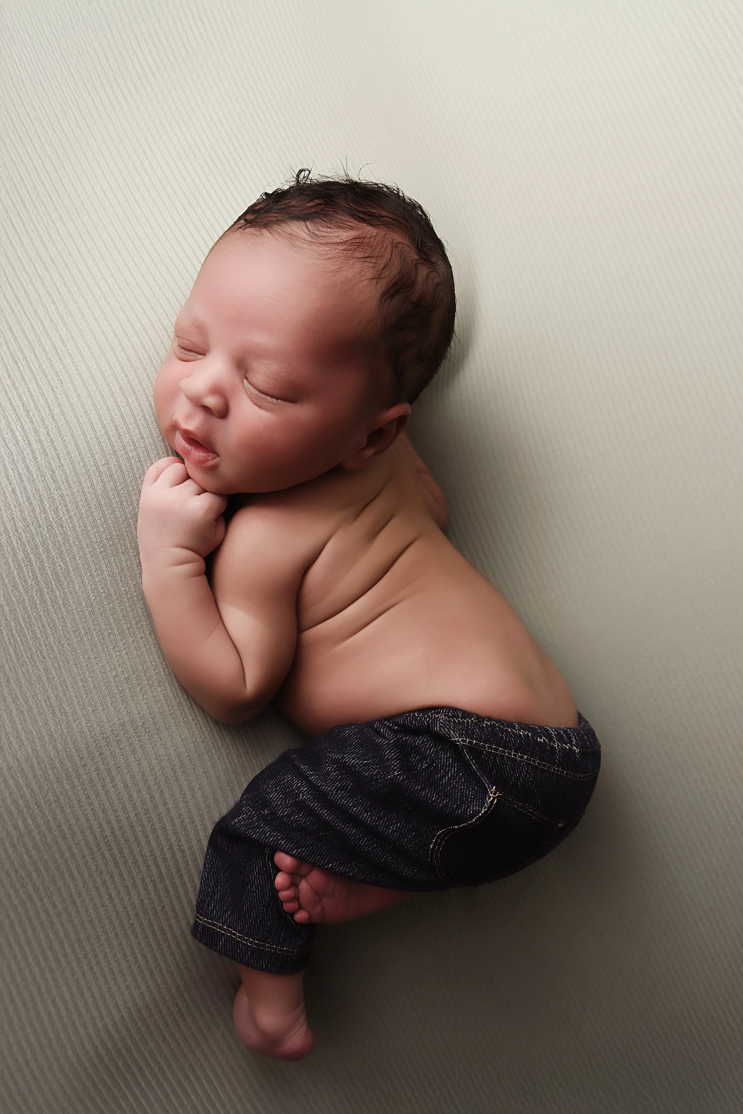Baby boy posed on his side wearing miniature jeans, resting peacefully on a soft textured background