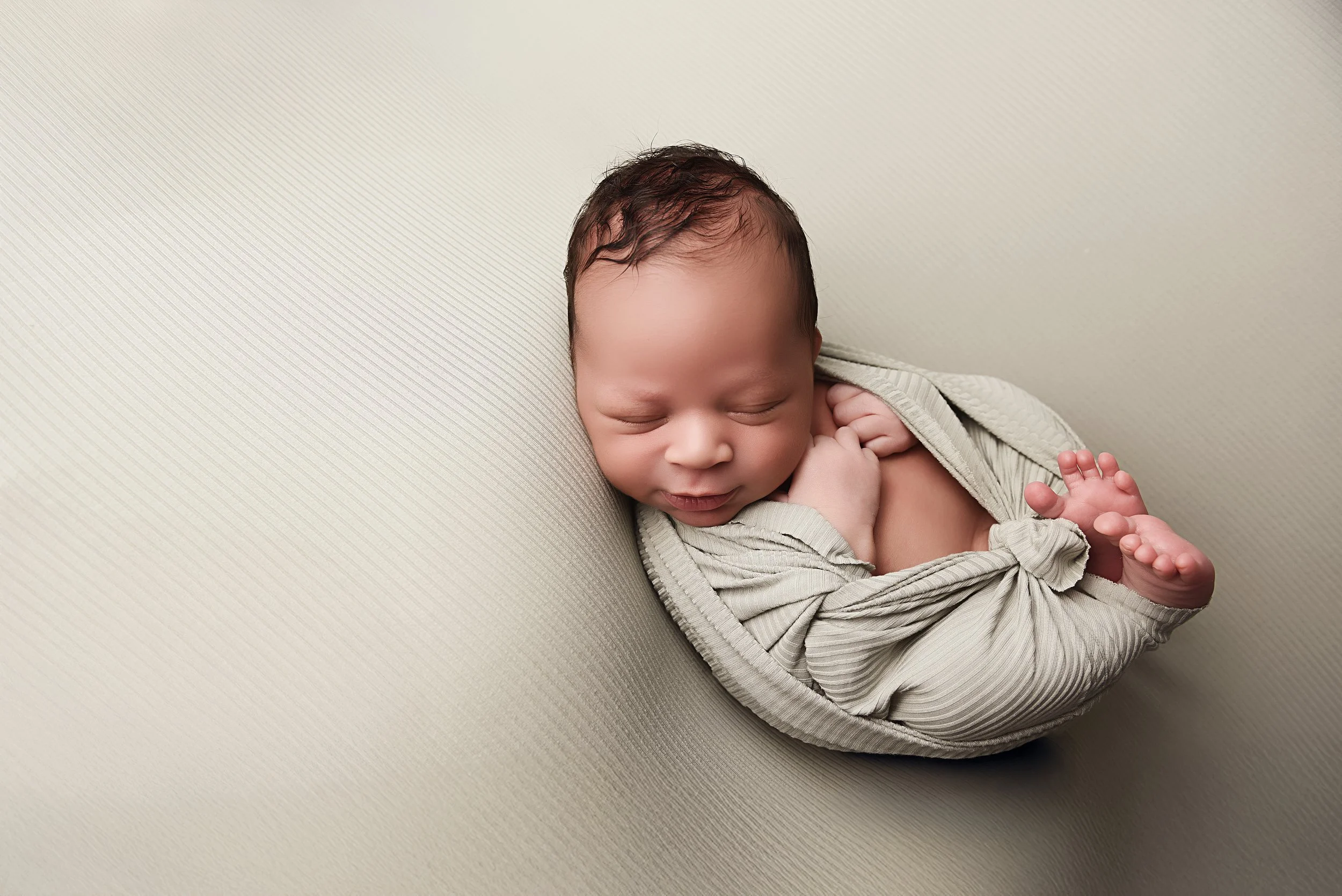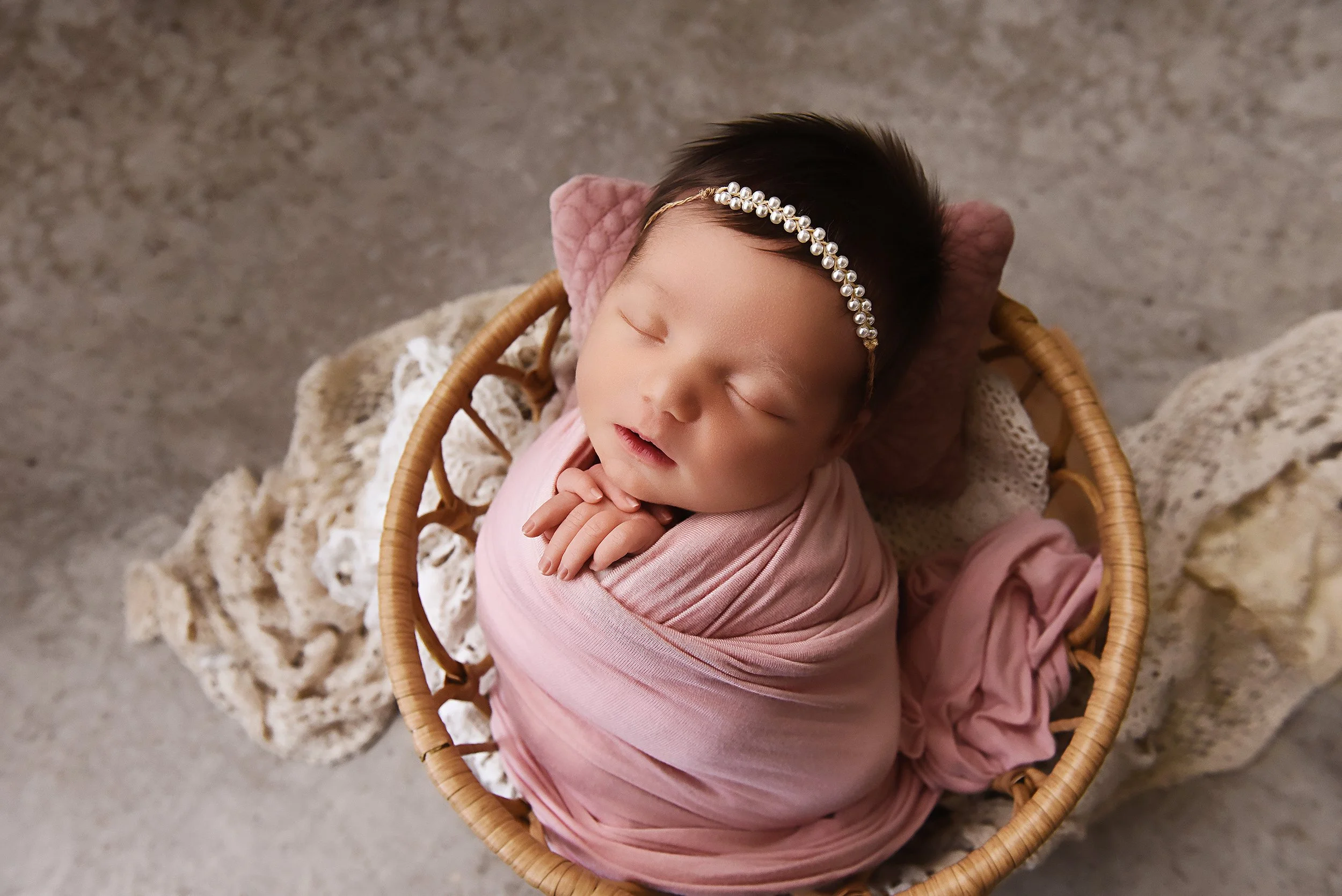 Tightly wrapped pose showing tiny feet and gentle hand placement on a pink cushion