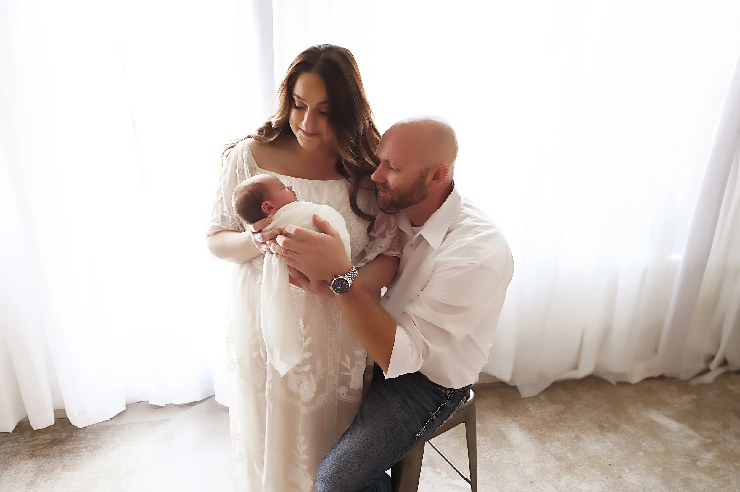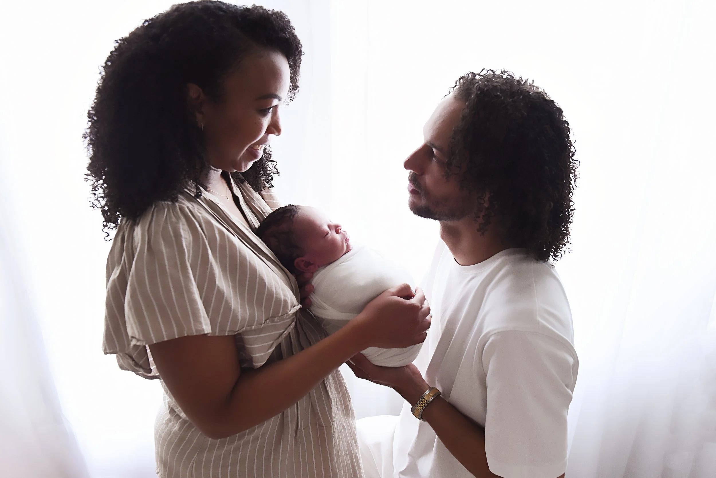 A connected moment between parents, celebrating their newborn baby wrapped in a swaddle during a bright studio session