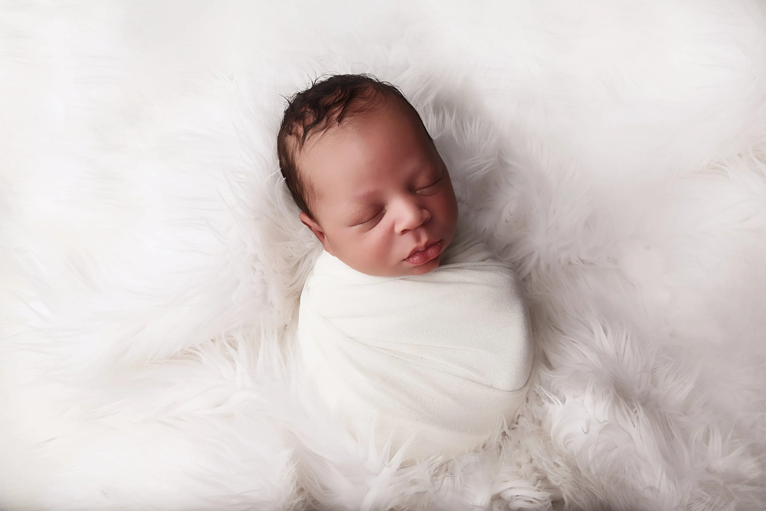 A timeless newborn portrait with a baby girl swaddled in white, her head adorned with a delicate cream bow