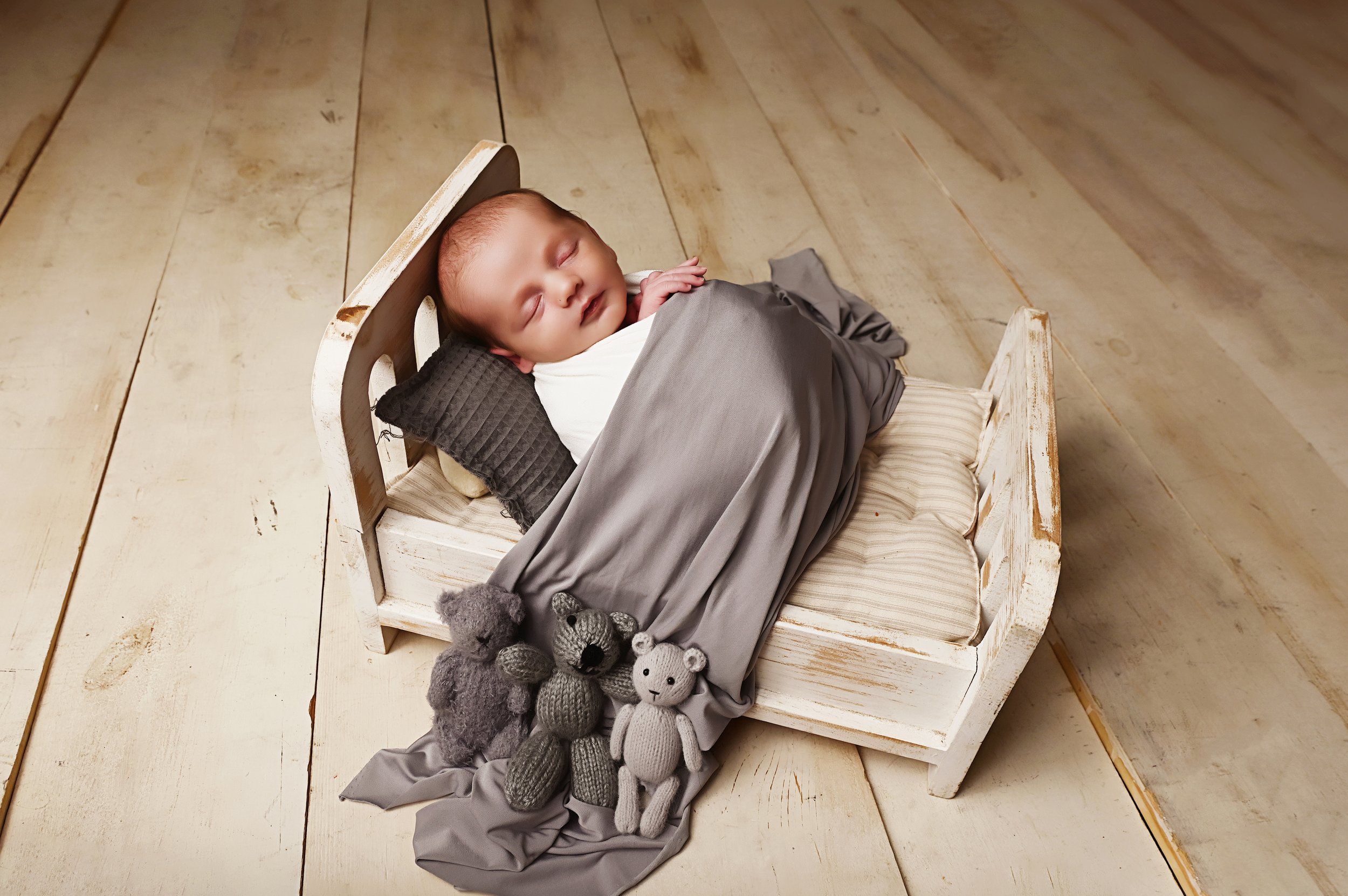 For Oliver’s session, we started with a soft cream wrap and matching fur layer for a cozy and timeless look. Then we moved to a rich sage green fabric that made his little features pop. We finished with a rustic wooden cradle setup that gave his gallery a classic touch his parents loved.