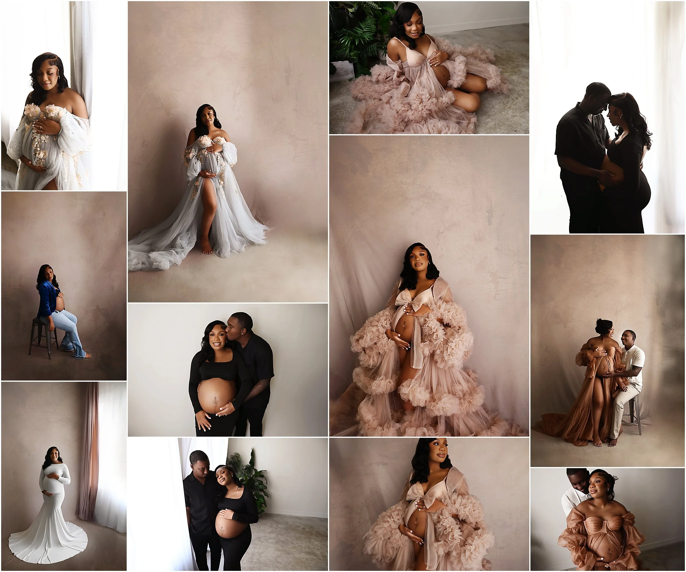 A luxury maternity studio collage showcasing timeless portraits of an expecting mother styled in neutral and blush-toned gowns, tulle robes, and classic bodysuits. Captured by Shreveport Maternity Photographer Leslie Whitaker, this session blends soft light, emotion, and artistry to celebrate motherhood with sophistication and grace. The combination of solo and couple poses captures the beauty of pregnancy in every frame.