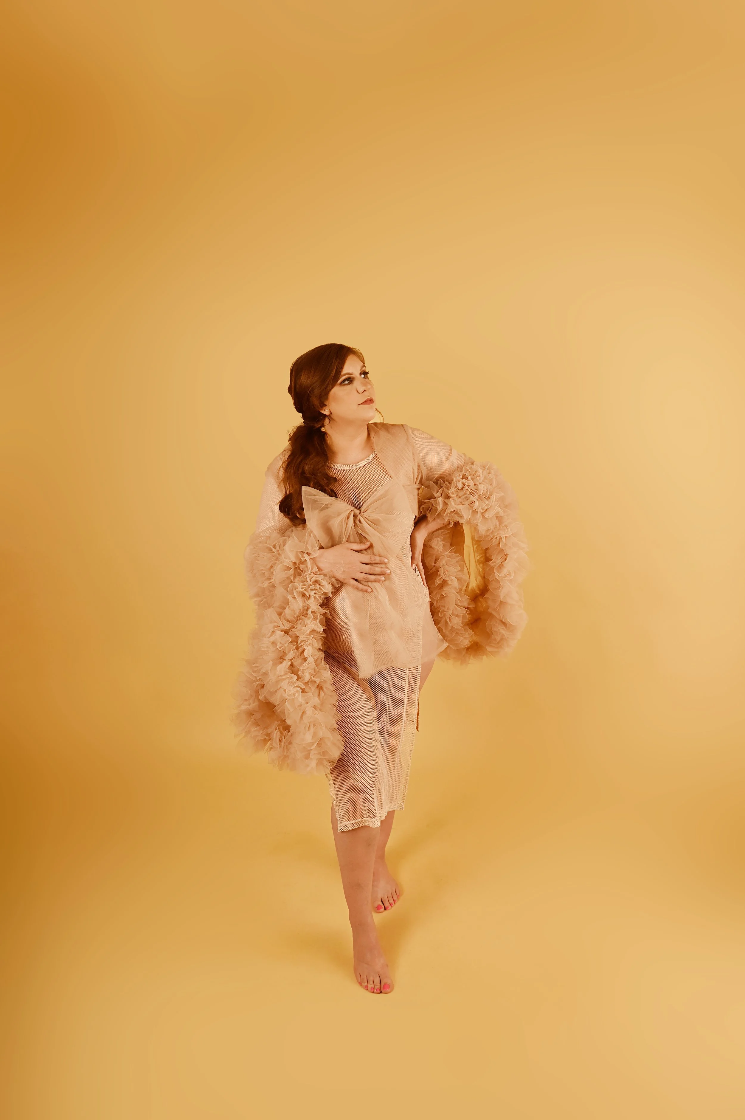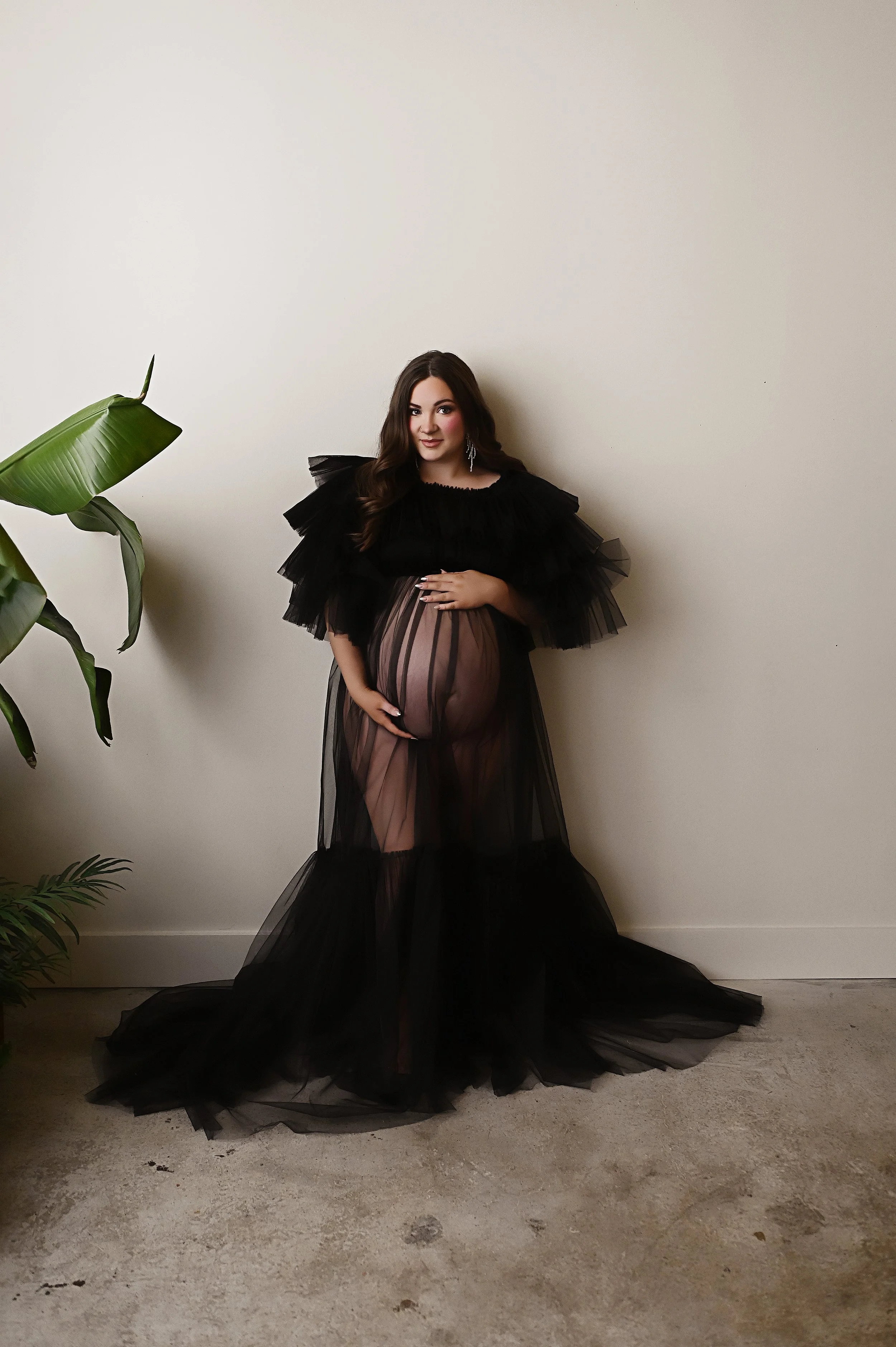 This gown is actually a robe! It can be worn on the shoulders, off the shoulders, open front or closed!