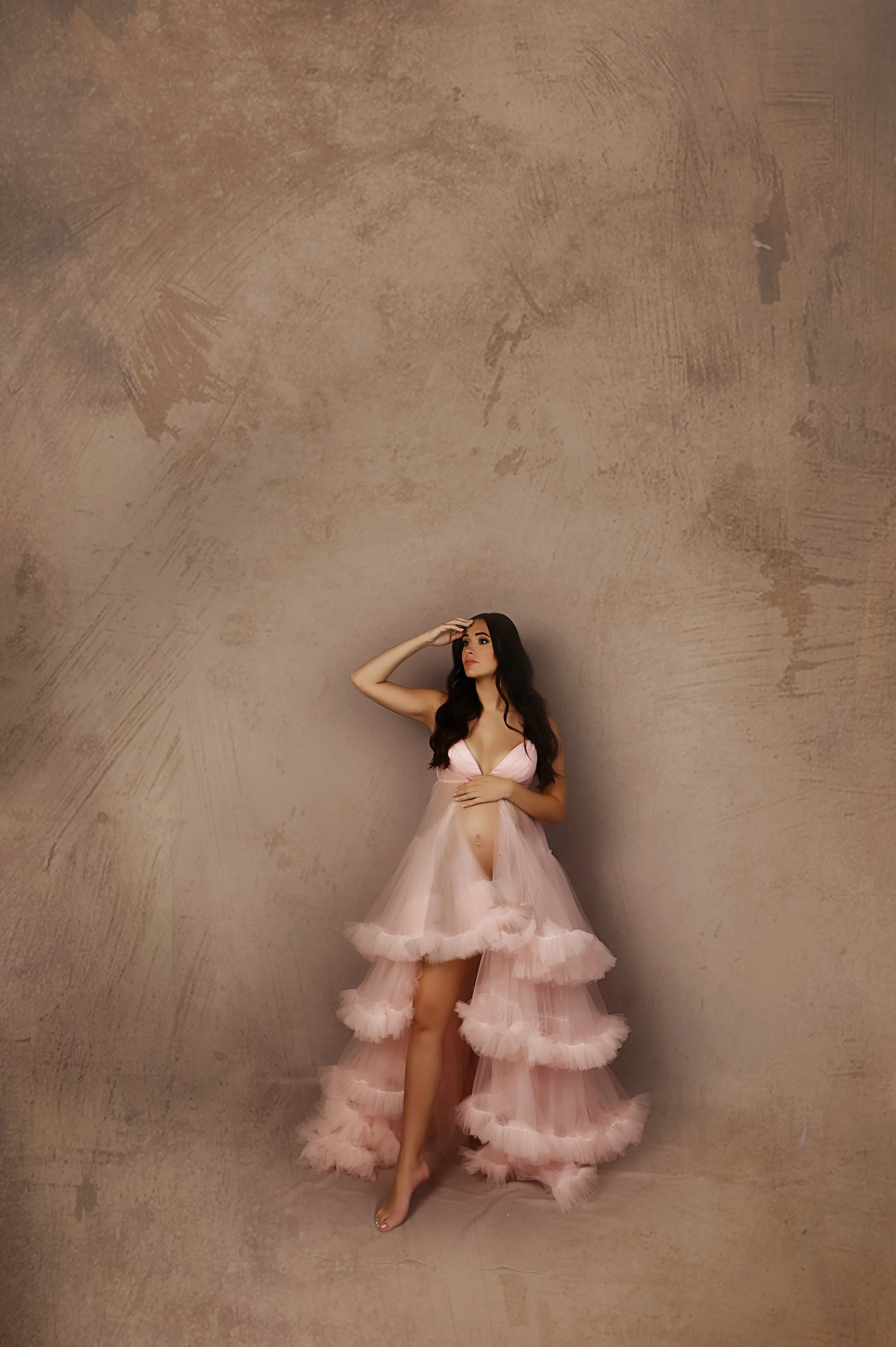 This gown has a corset back and the most beautiful layer of fabric with stones that goes just over the belly!