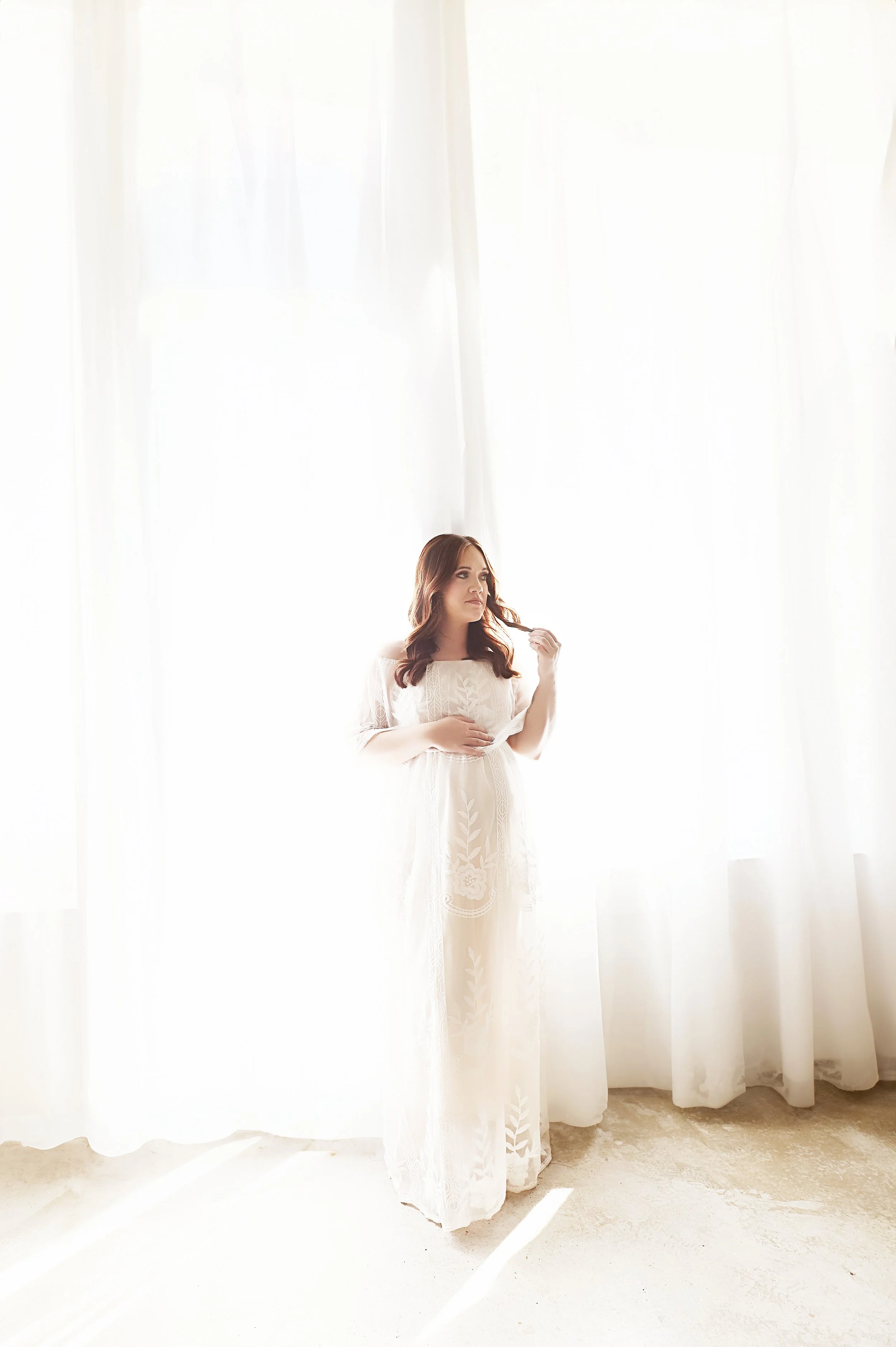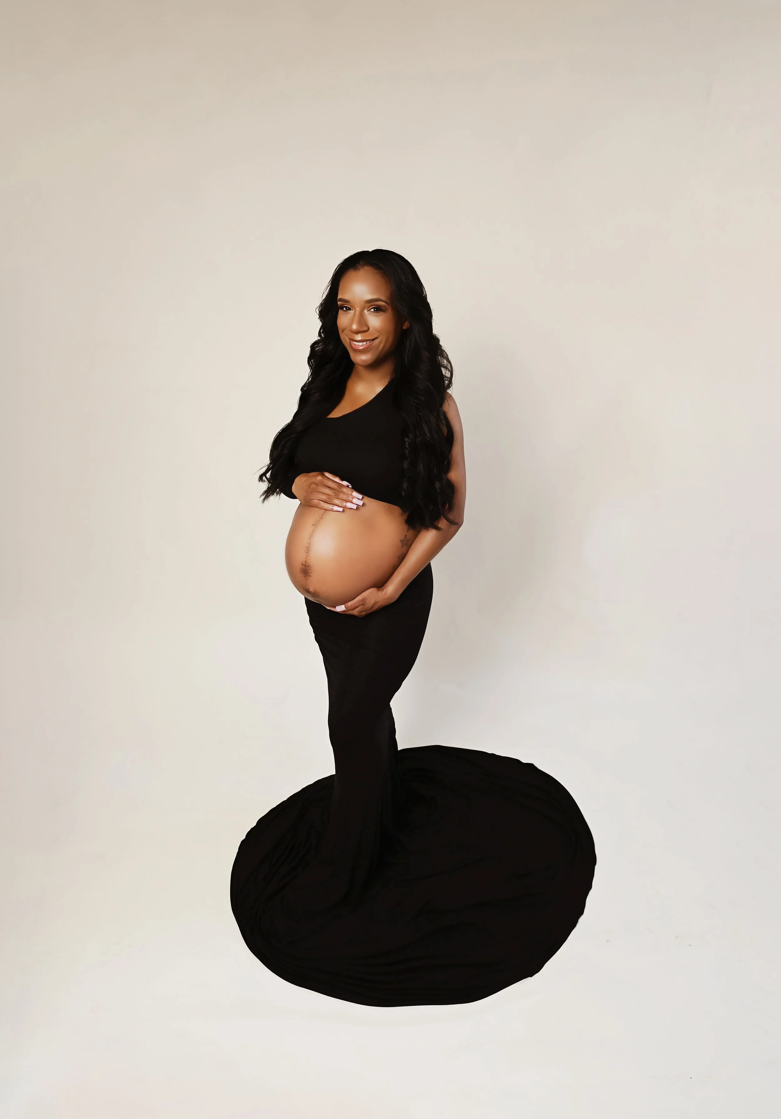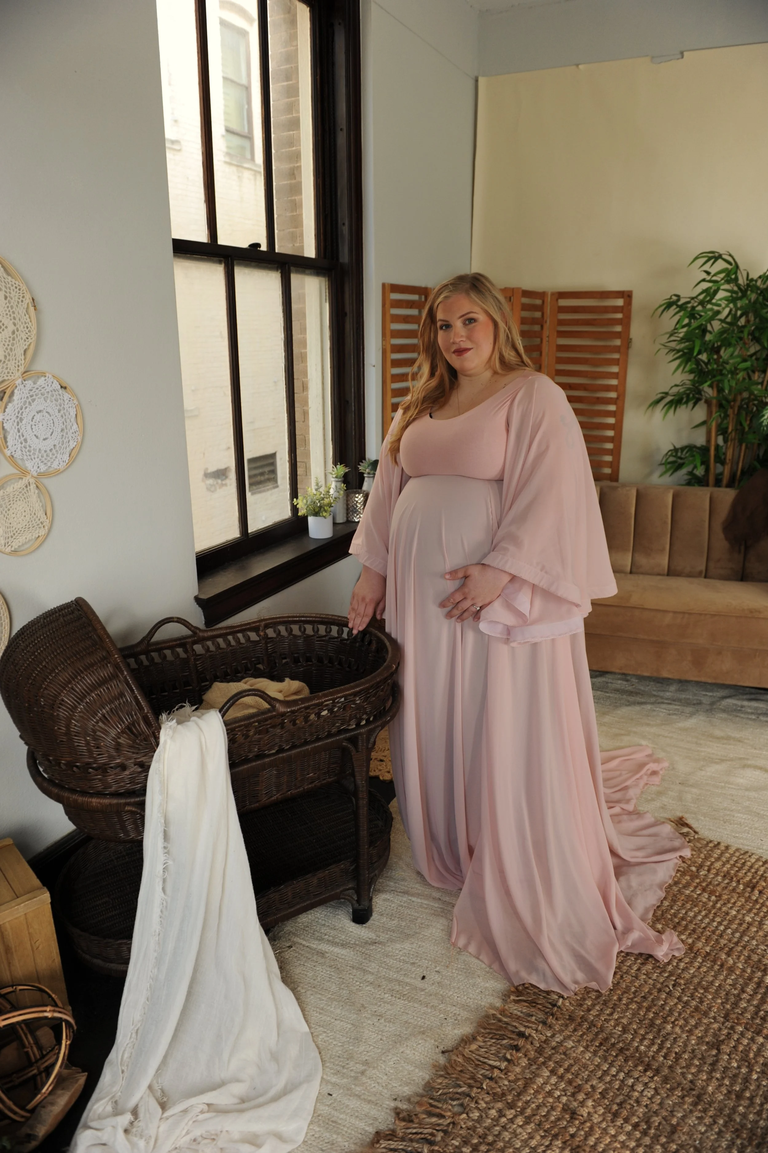 This white gown is best for our smaller Mamas, size xs-L. It will fit up to 2x, and I wore it when I was pregnant, but it was a little tight. :)